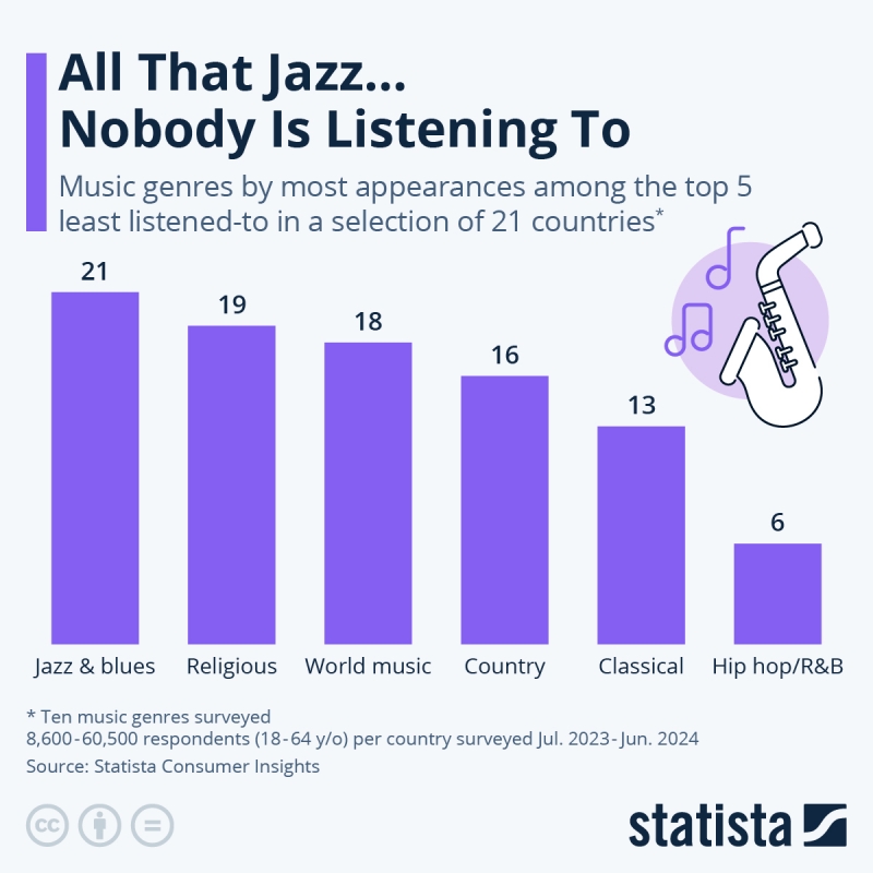 爵士樂和藍調音樂都是人們最少聽的五種音樂類別之一。