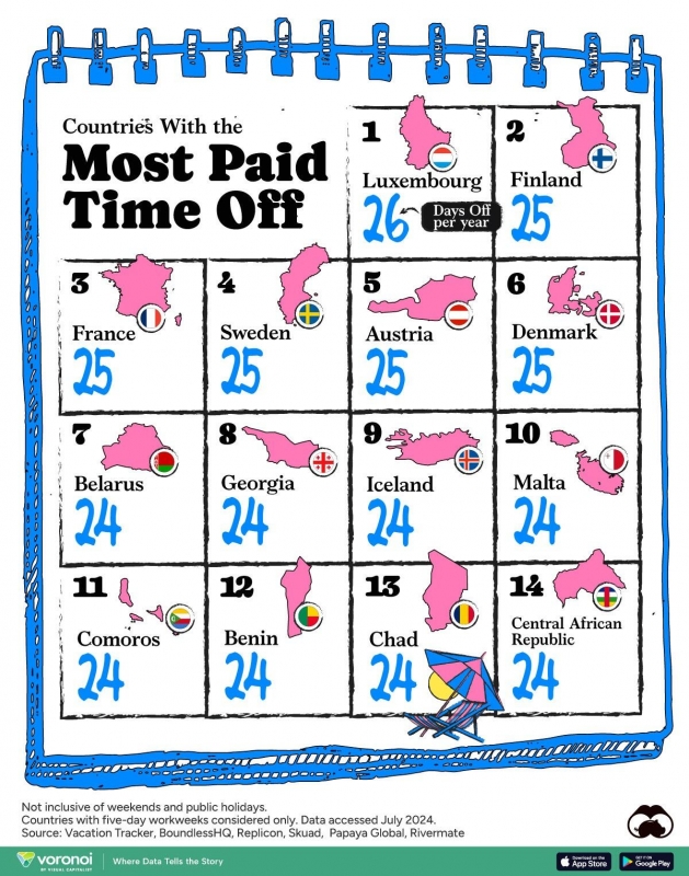 盧森堡和芬蘭為員工提供了最多的「帶薪休假」。